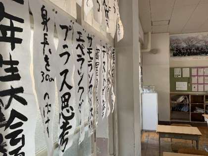一昨日に行われた書初め大会の作品を、2年生は廊下に掲示しました。通りすがりの生徒が「うまっ!」と口にするのがよく聞こえてきます。一人一人が集中して書き、よい作品が生まれた証だと思います。1年生の教室には新年の目標も掲示されています。ユニークな目標もあり、新年を明るく迎えられたのではないでしょうか。