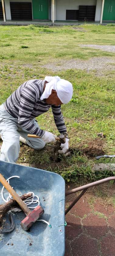 朝から、3年生の教室にはトンカチと音が響いたかも知れません。校内整備員の方が、切り株を割り、さらにのこぎりで切ってみえました。