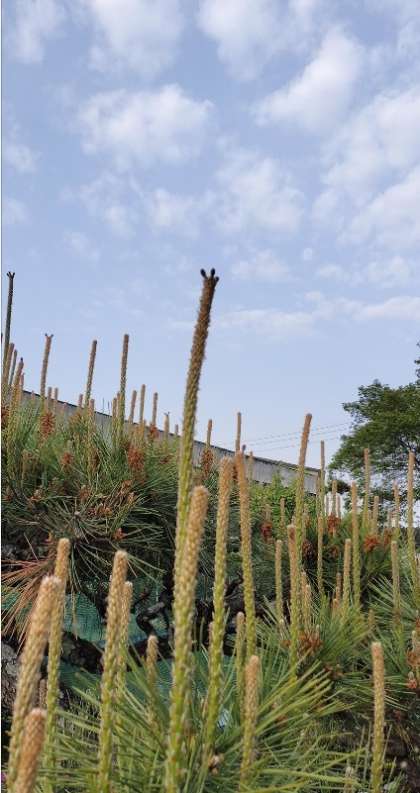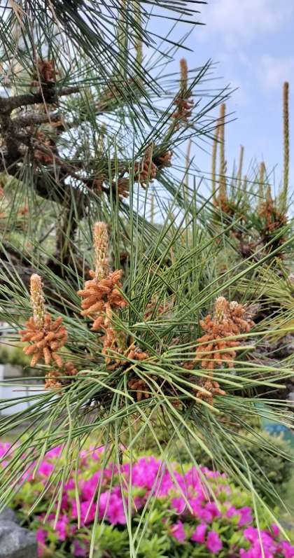 松は1年生の理科で学びます。【写真上】が花粉を出す雄花、【下】がタネになる雌花です。教科書ではここまでしか教えません。
