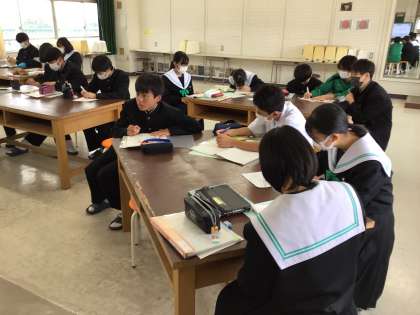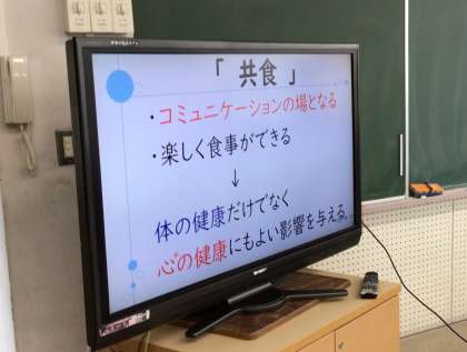 家族で一緒にご飯を食べること(共食)は、心の健康にもよいことを学んでいました。生徒の一人が「親と仲が悪かったらどうなんだろう?」と、つぶやきました。子どもの中で問いが立つ瞬間でした。素敵です。