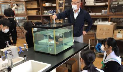 実験など、体験できるものは体験させたいです。ICTはそのあとの確認で使うと便利です。水圧の実験を観察しています。「斜めに入れたら?」と教師がゆさぶりをかけ、子どもたちはじっくり観察しています。