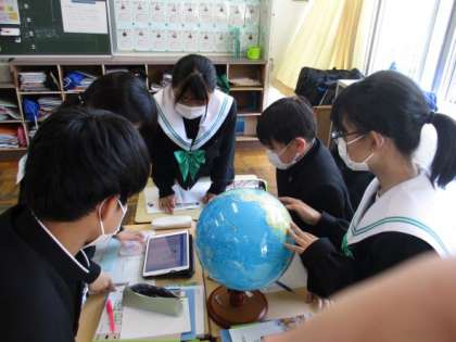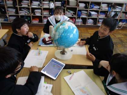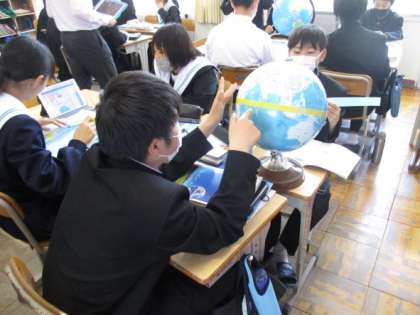 4/28 顔を寄せ合って学び合い(1年社会科) 公開日 2023/04/28 更新日 2023/04/28 生徒の活動 面積はどうなるんだろう? 世界地図の不思議をタブレットのSKYMENUと地球でグループ学習。顔を寄せ合い、目を輝かせていました。