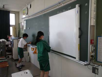 授業後に、黒板を消す、ICT機器を片付けるといった係活動を丁寧に行っていました。足を止めて見入りました。