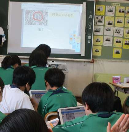 中世ヨーロッパの画像から考える社会科の授業での1コマ。生徒は一人ひとりが画像から「何をしている」のか推測し、意見交換しています。子どもの中でたくさんの問い「?」が浮かんだようです。