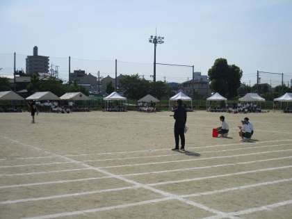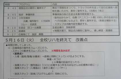 5月15日の予行練習で想像以上に競技の準備と移動に時間がかかることがわかりました。仕方ありません。生徒はだれも全校開催を中学校で経験していないのです。学年競技は全学年4種目ずつあります。全校で12競技を全て行いたいという考えから、先生たちも知恵を出し合いました。先生たちも生徒とともに「取組一番」を目指しています。