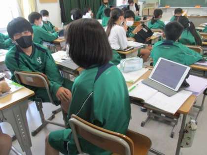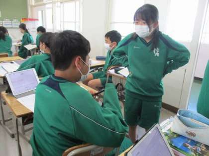 5/24 1年生英語:他己紹介 公開日 2023/05/24 更新日 2023/05/24 校長室から 友達の紹介をする英語の授業でした。スピーチは、タブレットで互いに録音しています。聞き手の子が、優しい表情でていねいに聞いているのがよかったです。