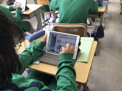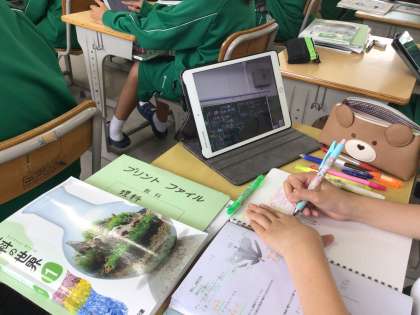 生徒が学習を進めている様子です。板書を写したものをノートにまとめたり、授業で使用したプリントのデータをダウンロードして何度も解いたりしていました。それぞれが自分で考え、効果的に学習用タブレットを活用して勉強していました。みんなガンバレ!