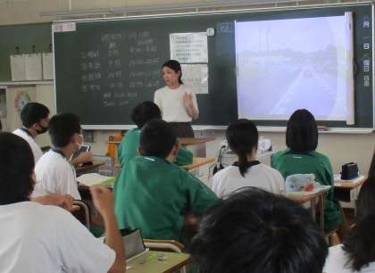 5月31日(水)の朝、一歩間違えば大事故になった出来事がありました。ドライブレコーダーの動画をご心配いただいた方が送ってくださったのですが、写真の竹村地区から降りてくる高架のところで、前の赤い車との間をすり抜けて横断した生徒がいました。高架からの下り坂、しかも朝は特に車が急いでいます。動画を見て血の気が引きました。無事で何よりでした。