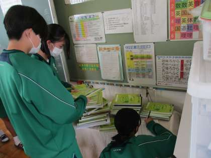 テストが終わってすぐに、係の生徒が提出物を回収していました。一冊一冊確認し、順番に並べるのはなかなかたいへんです。責任感ある仕事ぶりでした。