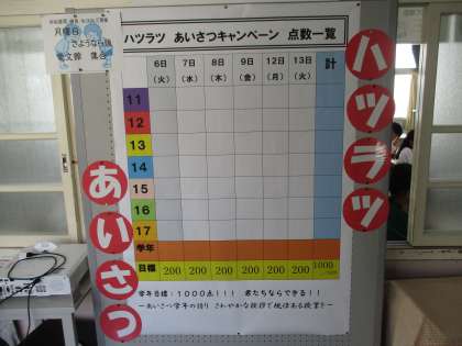 6/5 先輩が居ない間に、成長するぞ! 公開日 2023/06/05 更新日 2023/06/05 各学年から 3年生は明日から3日間修学旅行です。2年生も3日間職場体験です。学校は1年生だけになります。この機会に1年生はあいさつについての取組を始めるようです。成長が楽しみです。