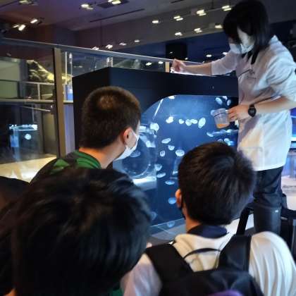 クラゲの餌やりに興味津々。 修学旅行の様子の多くは活動の記録(非公開ページ)にアップしています。