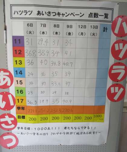 1年生は、ハツラツあいさつを競っています。 よいよ明日が最終日! 目標達成かな?