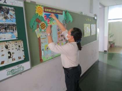 ALTが、英語に親しむための掲示物を作ってくださっています。フォリピンから来て4年。立った4年であれだけ日本語が話せるのもすごいですね。時に生徒から日本語を教えてもらっているみたいです。