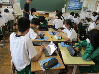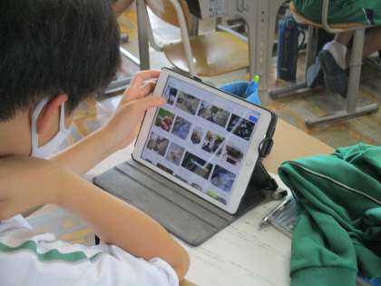 また、別の学級では先生が「タールって知ってる?・・・画像用意しようと思ったけど、とても見せられ・・・」と子どもに投げかけ、先生が画像を提示するのではなく、生徒自身が進んでタブレットで調べてる授業を展開していました【写真中と下】