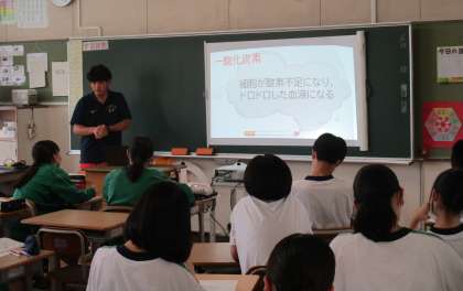 プールの合間をぬって、生活習慣病の授業を2年生が行っていました。SKYMENUの発表ノートで自ら調べたことをまとめている学級がありました【写真上】