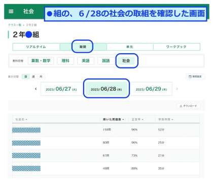 〈写真〉のように、Qubenaは、問いた問題数、正答率、学習時間などのデータが、リアルタイム、日、週、月によって一人一人のデータとして先生たちの画面で確認でき、取組の姿として蓄積できます。また、Qubenaは他学年の問題もできるので、小学校の内容から学び直しができます。