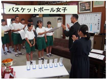 全校集会 表彰式(野球・バスケットボール) 公開日 2023/07/23 更新日 2023/07/23 学校行事 全校集会は熱中症対策でリモートで行いました。 校長室まで、各教室からの温かい拍手が届きました。 名前を呼ばれたときの元気な返事も心に残りました。 表彰された選手やチームだけでなく、練習そして大会に全力を尽くした生徒全てを称えました。
