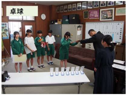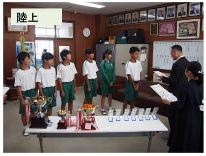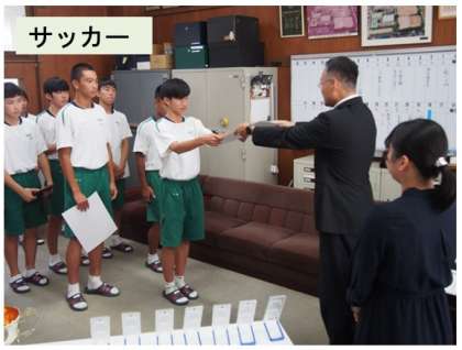 全校集会 表彰式(卓球、サッカー、陸上) 公開日 2023/07/23 更新日 2023/07/23 学校行事 全校集会は熱中症対策でリモートで行いました。 校長室まで、各教室からの温かい拍手が届きました。 名前を呼ばれたときの元気な返事も心に残りました。 表彰された選手やチームだけでなく、練習そして大会に全力を尽くした生徒全てを称えました。