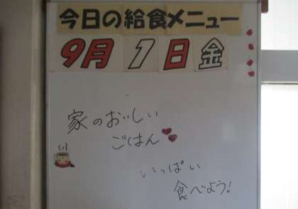 「今日の献立」にある温かいメッセージ。9月の献立がまだわからなかった7月最終日に、給食委員が気を利かせて書いてくれていました。ありがとう!