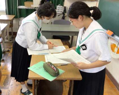 9/14 この準備があるから(広報委員) 公開日 2023/09/14 更新日 2023/09/14 生徒の活動 月1回、わずか30分の生徒会活動ですが、この活動が生徒の主体性を高めています。写真は広報委員の子が昼の放送の原稿をチェックしているところです。この準備があるから、あれだけ聞かせられる放送になるのですね。