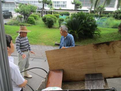 公務手と校内整備員がリヤカーに大きなベニアを立て防護壁にすることで飛び石を防ぐようにひと工夫してくださいました。でも、リヤカーを都度動かさないといけないのでとても大変です。
