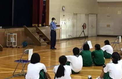 この授業では、デジタルのメリットを認識し、上手に活用しながら、さらにどうしたら危険性を回避できるか考えました。生徒と年齢が近い警察官から、「困ったときは、必ず大人に相談しよう」とアドバイスをいただきました。
