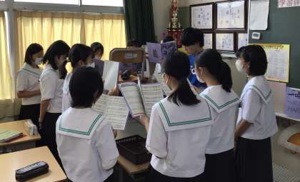 10/2 1−1 合唱 スピーカーが! 公開日 2023/10/02 更新日 2023/10/02 生徒の活動 よくまとまった練習には工夫がありますね。パート練習の音取りの場面で、スピーカーを耳の高さになるようにして、音を聞きながら歌っていました。