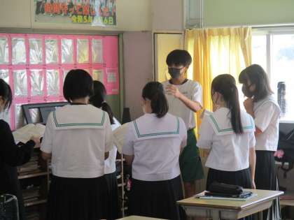10/2 3-5 合唱 自分にできることを 公開日 2023/10/02 更新日 2023/10/02 生徒の活動 5組が清掃の時間の後に練習していました。指揮者は歌に合わせて練習を、また、一秒を惜しんで着替えながら歌っている子たちもいました。3年生にとっては、最初で最後の合唱コンクールです。
