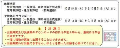 学校にWeb出願の全県試行(全県での練習)について詳細情報が届きました。進路通信(No.6)でお伝えしたように、予定通り10月19日(木)から出願の練習ができるようになります。今回の練習は受験票のダウンロードまでできるそうです。