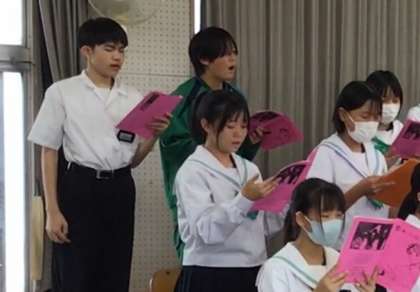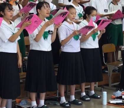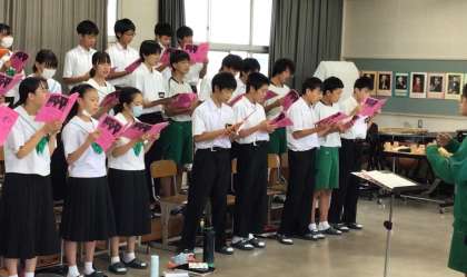 10/4 2ー5 合唱 言葉を噛み締めて 公開日 2023/10/04 更新日 2023/10/04 生徒の活動 音楽の授業です。生徒は歌詞の子音を噛み締めて歌う練習に熱中していました。その姿に引きつけられ、足を止めてじっくり参観しました。