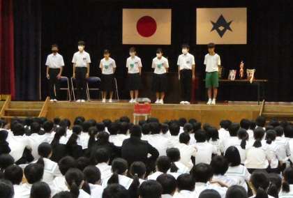 全校集会が始まる前に、後期生徒会執行部が宣誓を行いました。後期はどんな取組に力を入れていくのか、期待が高まりました。