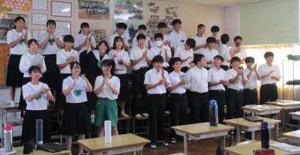 10/15 3-7合唱 温かい出迎え 公開日 2023/10/16 更新日 2023/10/16 校長室から 13日(金)、7組から「合唱を聞いて、指導してほしい」というオファーがありました。 部屋に入ると拍手が。合唱曲を聞く前から、合唱づくりを通して仲間の絆が深まっていると感じました。出だしや歌い終わりなど、少しだけアドバイスしました。
