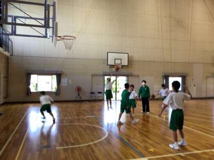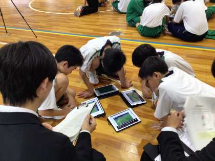 今日は、大学の先生と生徒7名が来校し、授業を参観しました。プロ選手の動画から、ブーメラン、シュリケン、V字の動きを見つけ、その動きを2:2の場面で試してみるという展開でした。「子どもたちのもっている技量や意識から考えると、少し授業内容が難しい」「一つ一つの活動には目的があり、目的と照らした話し合いができるといいね。」などのご指導をいただきました。改めて、授業づくりの面白さ、奥深さを実感しました。