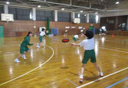 アルティメット(ドッヂビーを使ったゲーム)の授業が進み、生徒は動きながらパスを出せるようになってきています。「もう少し前だったね」「ナイス」……目的がはっきりした練習のため、励ましや賞賛の声が多く聞こえました。