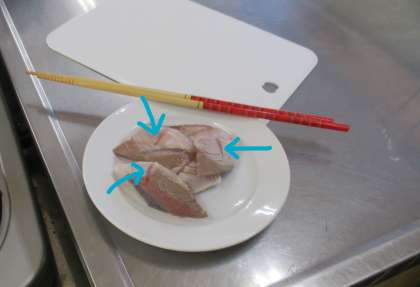 箸を使って湯引きしていたので、箸の当たる場所は霜降りになりません。料理人はどうやって霜降りにしているのだろうと、???が生まれました。生徒の皆さんも疑問をもったかな?