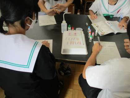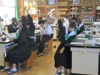 11/7 3年理科:実験結果を共有する 公開日 2023/11/07 更新日 2023/11/07 生徒の活動 酸・アルカリの実験を班で行った後で、結果を共有します。実験が楽しいだけではなく、実験結果から何が分かるのかを仲間と見出していくところに理科のおもしろさがありますね。