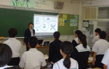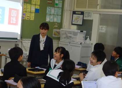 1年6組で、初任者の代表として本校教諭が英語の授業を行いました。授業全体の流れをよくつかみ、的確な指示・説明で、生徒は迷いなく表現活動を楽しんでいました。