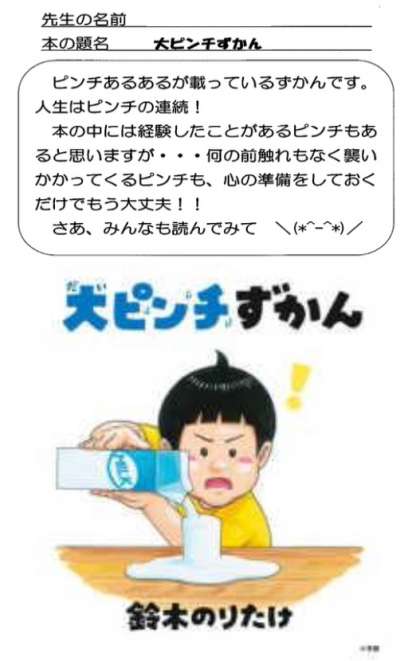 図書委員会企画:おすすめ本4 公開日 2023/11/11 更新日 2023/11/11 生徒の活動 おすすめ本は→→→こちら 図書委員会が先生のおすすめ本を図書室で紹介してくれています。せっかくですので学校HPでも週末を中心に紹介していきます。先生の名前は隠しています。誰のおすすめか予想してみてください。図書室には先生の名前も掲示されます。