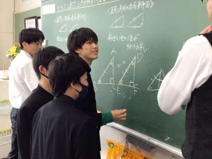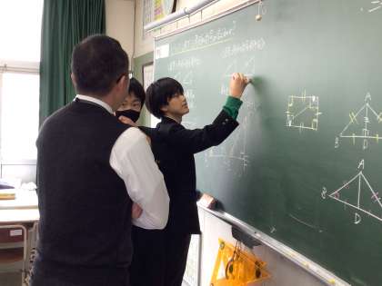 2年生の数学の授業です。グループでの学び合いの授業でしたが、チャイムで終わった後、さらに生徒が数学の先生のところに行って、「こういう方法もあるのでは・・・」と熱心に説明していました。