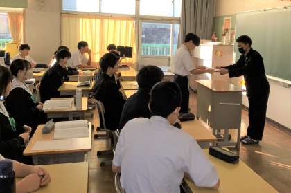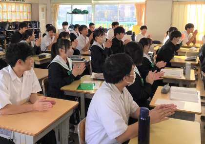 12/13 称える:あいさつじゃんけんP 公開日 2023/12/13 更新日 2023/12/13 生徒の活動 朝の会では、先週行われたあいさつじゃんけんプロジェクト結果発表と優秀クラスの氷床が行われていました。生徒たちの努力を生徒会執行部が認め、称える、素敵な時間でした。
