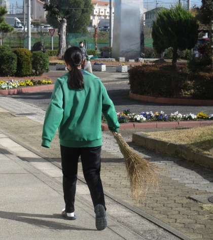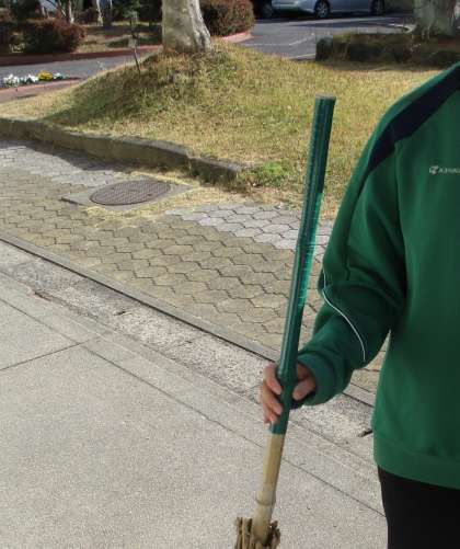 竹ぼうきの柄にビニテが巻いてあるものがあります。これは、竹ぼうきを修理した時に、生徒が竹のささくれでけがをしないようにと、校務支援員さんが巻いてくれたものなのです。