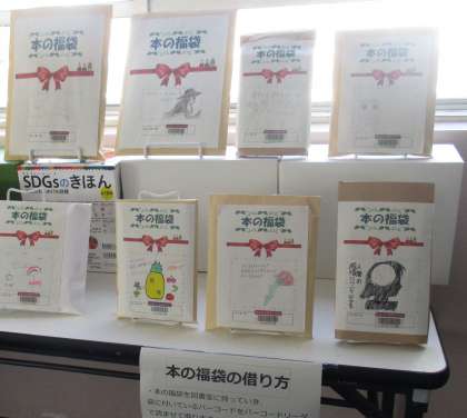 12/16 冬も心豊かに読書を楽しもう 公開日 2023/12/16 更新日 2023/12/16 校長室から 図書委員が図書館司書さんと連携して、お年玉企画を展開しています。 「本の福袋」という企画です。袋の中にどんな本が入っているか、委員のイラストやコメントがおもしろいです。 よく見ると、袋にバーコードがついていて、袋ごと借りられるようになっています。「本を好きになってほしい。」という願いが伝わってきますね。