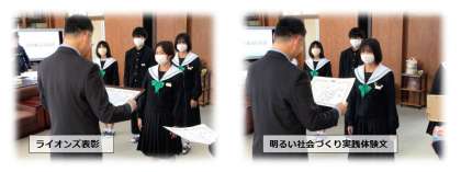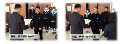 冬休み前集会では秋の部活動大会、秋の文化的な活動などの表彰を行いました。また、合わせて後期の生徒会役員などの認証も行いました。
