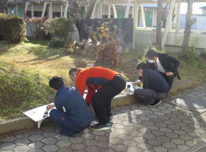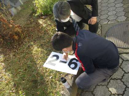 学級の場所が外からわかるプレートが校舎には貼ってあります。その文字が消えかけているクラスがありました。文字の型紙を作り、黒スプレーを使ってプレートを作っていました。