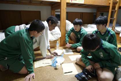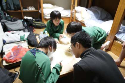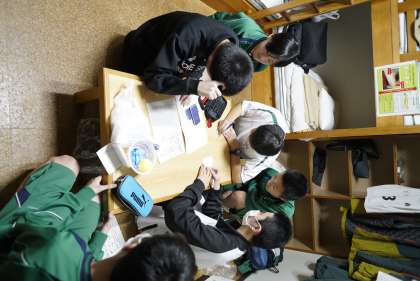 食事と入浴を終えて、班別レクリエーションをしています。各部屋ごとに楽しそうな声が聞こえてきます。賑やかだった談話コーナーから人がいなくなり、部屋の友達同士での交流を深めています。班別レクスタッフが準備してくれた課題に対し、みんなで話し合う姿です。