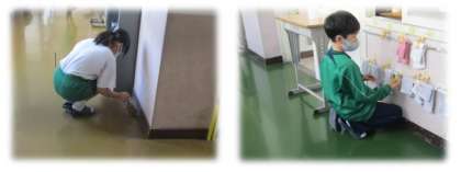 大変うれしい話ですが、私は日ごろから隅のゴミが気になっており、「まだまだ気づける。もっとできる。」と思っていました。改めて、そうじ中の子どもたちの姿を見ると、ちょっと廊下を歩いただけで写真のような生徒がたくさん目に入りました。お客様が視点をくださったおかげで、生徒が一心にそうじする姿に気づくことができました。