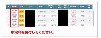 ★写真中「検定料納付待ち」になっている場合、学校での確認を終えていますので必ず期限前日の31日(水)までに検定料を納付してください。