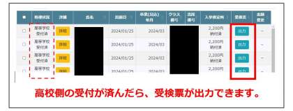 ★写真下「高校受付済」となっている場合、入学願書が受理され受検の準備が整ったことになります。受験票を出力(プリントアウト)することができます。