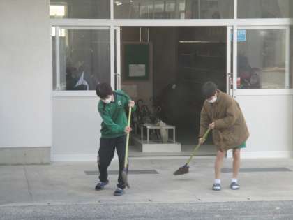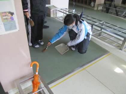 写真の昇降口そうじは職人の域で、ほれぼれします。10分のそうじで砂粒一つない状態になります。スロープ部分は滑り止めのため溝が切ってあるのですが、その溝の砂もほとんどありません。コンクリートの部分は、砂を掃いた後がうっすら筋になるくらい、砂という砂を取り除きます。