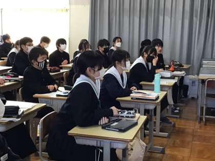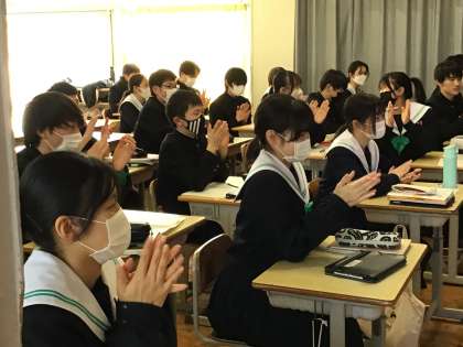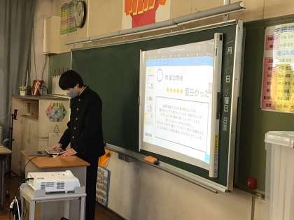 社会科の授業では、自分が選んだ県をPRする発表型授業を行っていました。生徒の聞き方が素晴らしく、発表者も伝えやすかったでしょう。写真のような発信力は、授業を通して特に伸ばしたい力です。